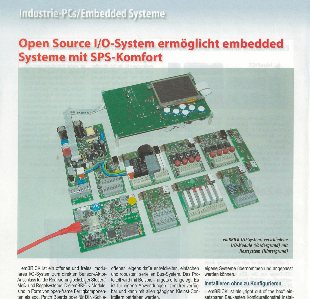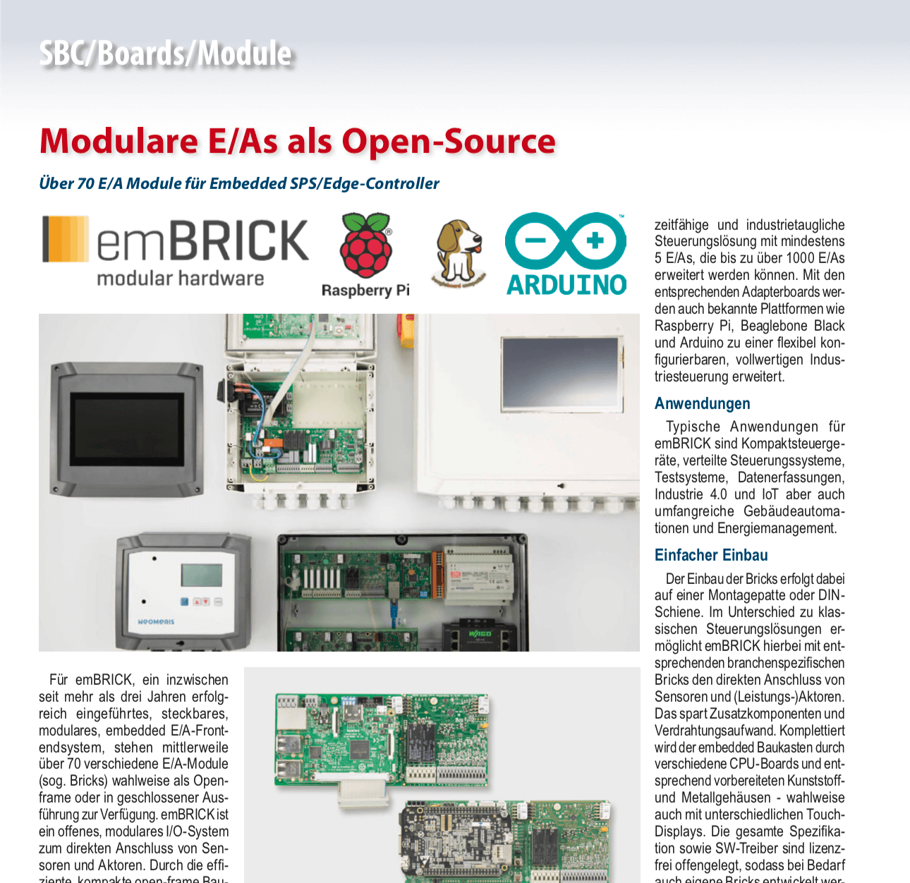 Nach vielen Anfragen präsentiert die emBRICK GmbH auf der SPS2019 erstmalig ihr gleichnamiges E/A-Hardwaresystem nun auch für CODESYS mit entsprechenden Bibliotheken. Kompakte "Out of the box" Industriesteuerungen, IoT-lösungen, Rapid Prototypes oder selbstentwickelte Bricks können nun auch mit der bekannten Programmierumgebung einfach realisiert werden. Für emBRICK, ein inzwischen seit mehr als drei Jahren erfolgreich eingeführtes, steckbares, modulares, embedded E/A-Frontendsystem, stehen mittlerweile über 70 verschiedene E/A-Module (sog. Bricks) wahlweise als Openframe oder in geschlossener Ausführung zur Verfügung. emBRICK ist ein offenes, modulares I/O-System zum direkten Anschluss von Sensoren und Aktoren. Durch die effiziente, kompakte open-frame Bauweise und einfache Ankopplung an jeden μC ist es eine einzigartige freie und universell einsetzbare embedded Steuerungslösung. Das System kann direkt via SPI oder mit einem Koppler via RS485, CAN oder Ethernet an jeden μC ...