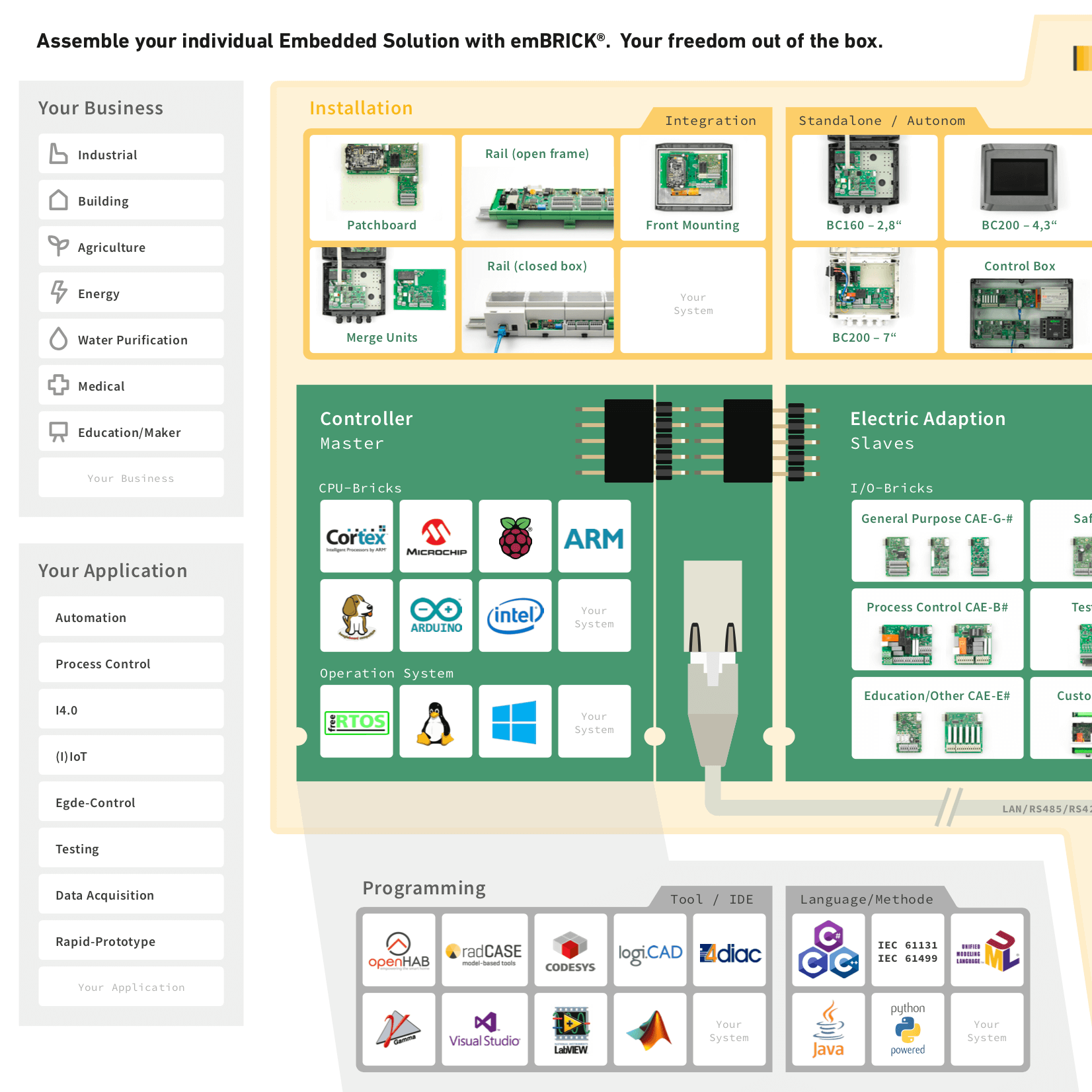 Gerne informieren wir Sie auf der embedded world zu folgenden Themen und Neuigkeiten: emBRICK® | Modulares E/A-System für Embedded-Steuergeräte/SPS, Edge-Controller, IoT, … - Open Source, extrem skalierbar (I/O, CPU, HMI, Housing) - viele Freiheitsgerade und unzählige Realisierungsmöglichkeiten - Über 100 Komponenten, darunter 70 E/A-Bricks und Komplettsyteme mit Gehäuse und Display Neu - Support und Evaluations-Kits für Rasberry-Pi, Arduino, Beaglebone-Black sowie MSVC, Labview, … - Robuste Fertigsysteme und Schaltschranklösungen „out oft he Box“ als schneller SPS-Ersatz - Zahlreiche neue Module/Bricks (Präzisionsmesstechnik, Testsysteme, ….) - viele Bricks nun auch als geschlossene Hutschienenlösung … oder schauen Sie einfach auf unser neues emBRICK Big-Picture und entdecken Sie die ganze Möglichkeiten von emBRICK auf einem Blick www.embrick.de. radCASE® | Modellbasiertes Software Entwicklungs-Tool - UML-basiert, Enterprise Architect kompatibel - Modellieren und Generieren von ... Serien-Code, HMI/GUI, PC-Simulation/-Monitoring, Dokumentationen - Version 5.0 nun verfügbar zum freien Download mit folgenden Neuigkeiten: ...